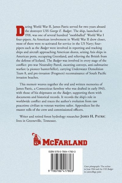 During World War II, James Patric served for two years aboard the destroyer USS George E. Badger. The ship, launched in 1918, was one of several hundred ""mothballed"" World War I four-pipers. As American involvement in World War II drew closer, most of them were re-activated for service in the US Navy; four-pipers such as the Badger were involved in reporting and tracking ships and aircraft approaching American shores, seizing Axis ships in American ports, occupying Greenland, and relieving the British from the defense of Iceland. The Badger was involved in every stage of the conflict, from pre-war Neutrality Patrol, escorting convoys, anti-submarine warfare (a pioneer hunter/killer), carrying Underwater Demolition Team 8, and pre-invasion (Frogmen) reconnaissance of South Pacific invasion beaches. This memoir weaves together the oral and written memories of James Patric, a Connecticut farmboy who was drafted in early 1943, with those of his shipmates on the Badger, supporting them with documents and historical records. The book records the ship's role in worldwide conflict and traces the author's evolution from raw peacetime civilian to veteran wartime sailor. Appendices list the muster rolls of the crew and commissioned officers.