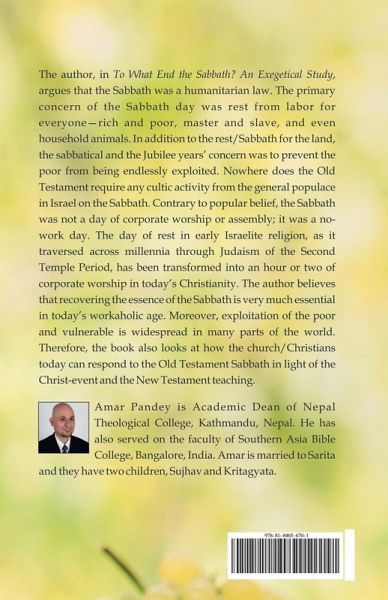 The author, in To What End the Sabbath? An Exegetical Study, agrues that the Sabbath was a hummanitarian law. The primary concern of the Sabbath day was rest from labor everyone-rich and poor,master and slave, and even household animals. In additon to rest/Sabbath for the land, the sabbatical and the Jubliee years' concern was to prevent the poor from being endlesslu exploited. Nowhere does the Old Testament require any cultic activity from the general populace in Israel on the Sabbath. Therefore, the book also looks at how the church/Christians today can respond to the Old Testament Sabbath in light of the Chirst-event and the New Testament teaching