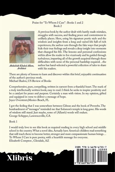 Praise for "To Whom I Care" : Books 1 and 2 Book 2 A previous book by the author dealt with hastily made mistakes, struggles with success, and finding peace and contentment in unlikely places. Here, using his signature poetic style and the wisdom and insights from a long and varied life full of rich experiences, the author cuts through the fake ways that people hide their true feelings and reveals a deep insight into moments that changed his life. The lessons and personal confessions within allow the reader to live vicariously and be guided through turbulence, imparting all of the growth acquired through these difficulties with none of the personal hardship required. ..the author has hand-selected a powerful collection of tales to share with his readers. There are plenty of lessons to learn and discover within this brief, enjoyable continuation of the author's previous work. Michael Radon, US Review of Books Comprehensive, pure, compelling, written in earnest from a thankful heart. The mark of a truly intellectually written book; easy to read. I think he seeks to inspire positivity and be a catalyst for peace and purpose. Certainly a man with vision. In my opinion, gifted and equipped in verse to deliver a message of hope. Joyce Overstreet,Mexico Beach, FL I got the feeling that I was somewhere between Gibran and the book of Proverbs. The bombardment of "messages" reminded me that Solomon's temple is long gone. His words of wisdom still stand. Just maybe, some of (Allam's) words will endure. George Schipper, Lawrenceville, GA Book 1 I would truly love to see this book as required reading in every high school and middle school in the country. What a novel idea. Actually have America's children read something that will teach them to become better, stronger and more compassionate human beings...To Whom I Care is pure poetry, with a heartfelt message for everyone. Elizabeth Compton , Glendale, AZ