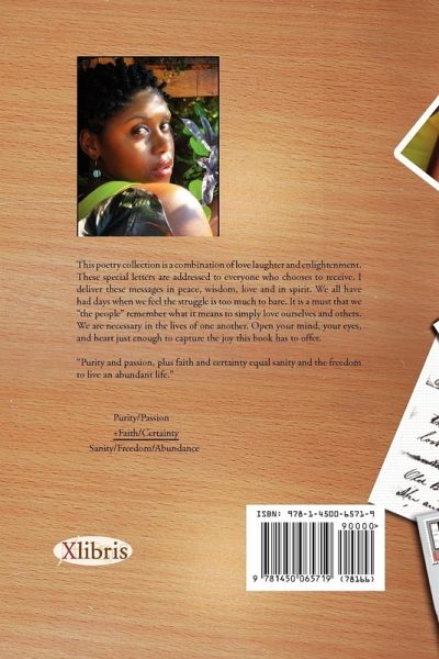 Book Summary This poetry collection is a combination of love laughter and enlightenment. These special letters are addressed to everyone who chooses to receive. I deliver these messages in peace, wisdom, love and in spirit. We all have had days when we feel the struggle is too much to bare. It is a must that we "the people" remember what it means to simply love ourselves and others. We are necessary in the lives of one another. Open your mind, your eyes, and heart just enough to capture the joy this book has to offer. "Purity and passion, plus faith and certainty equal sanity and the freedom to live an abundant life." Purity/Passion +Faith/Certainty Sanity/Freedom/Abundance
