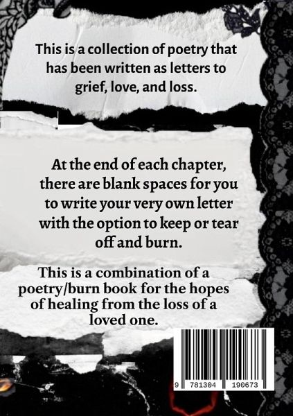 This is a collection of poetry written as letters to grief, love, and loss. At the end of each chapter, there are blank spaces for you to write your letter with the option to keep or tear off and burn. This is a combination of a poetry/burn book for the hopes of healing from the loss of your loved ones.