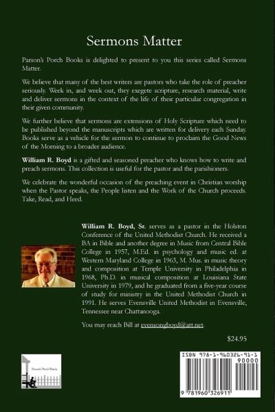 Parson's Porch Books is delighted to present to you this series called Sermons Matter. We believe that many of the best writers are pastors who take the role of preacher seriously. Week in, and week out, they exegete scripture, research material, write and deliver sermons in the context of the life of their particular congregation in their given community. We further believe that sermons are extensions of Holy Scripture which need to be published beyond the manuscripts which are written for delivery each Sunday. Books serve as a vehicle for the sermon to continue to proclaim the Good News of the Morning to a broader audience. William R. Boyd is a gifted and seasoned preacher who knows how to write and preach sermons. This collection is useful for the pastor and the parishioners. We celebrate the wonderful occasion of the preaching event in Christian worship when the Pastor speaks, the People listen and the Work of the Church proceeds. Take, Read, and Heed. William R. Boyd, Sr. serves as a pastor in the Holston Conference of the United Methodist Church. He serves Evensville United Methodist in Evensville, Tennessee near Chattanooga. You may reach Bill at evensongboyd@att.net.
