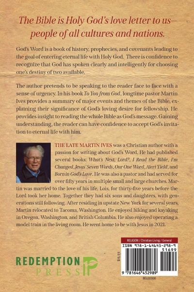 The Bible is Holy God's love letter to us-people of all cultures and nations. God's Word is a book of history, prophecies, and covenants leading to the goal of entering eternal life with Holy God. There is confidence to recognize that God has spoken clearl y and intelligently for choosing one's destiny of two available. The author pretends to be speaking to the reader face to face with a sense of urgency. In his book To You from God, longtime pastor Martin Ives provides a summary of major events and themes of the Bible, explaining their significance of God's loving desire for fellowship. He provides insight to reading the whole Bible as God's message.