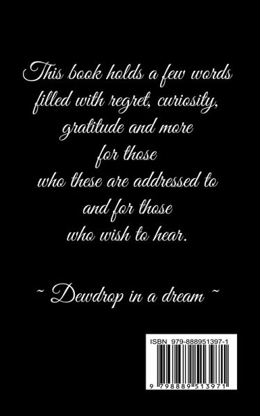 This book holds a few words filled with regret, curiosity, gratitude and more for those who these are addressed to and for those who wish to hear. ~ Dewdrop in a dream ~