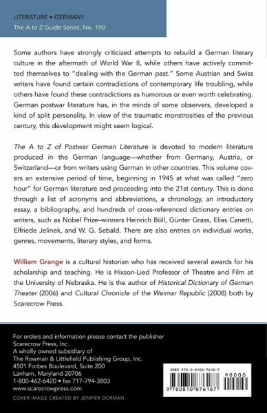 The A to Z of Postwar German Literature is devoted to modern literature produced in the German language, whether from Germany, Austria, Switzerland or writers using German in other countries. This volume covers an extensive period of time, beginning in 1945 at what was called "zero hour" for German literature and proceeds into the 21st century, concluding in 2008. This is done through a list of acronyms and abbreviations, a chronology, an introductory essay, a bibliography, and hundreds of cross-referenced dictionary entries on writers, such as Nobel Prize-winners Heinrich Böll, Günter Grass, Elias Canetti, Elfriede Jelinek, and W. G. Sebald. There are also entries on individual works, genres, movements, literary styles, and forms.