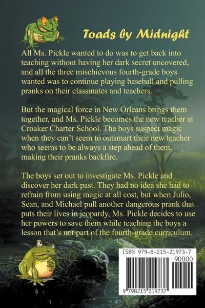 All Ms. Pickle wanted to do was to get back into teaching without having her dark secret uncovered, and all the three mischievous fourth-grade boys wanted was to continue playing baseball and pulling pranks on their classmates and teachers. But the magical force in New Orleans brings them together, and Ms. Pickle becomes the new teacher at Croaker Charter School. The boys suspect magic when they can't seem to outsmart their new teacher who seems to be always a step ahead of them, making their pranks backfire. The boys set out to investigate Ms. Pickle and discover her dark past. They had no idea she had to refrain from using magic at all cost, but when Julio, Sean, and Michael pull another dangerous prank that puts their lives in jeopardy, Ms. Pickle decides to use her powers to save them while teaching the boys a lesson that's not part of the fourth-grade curriculum.