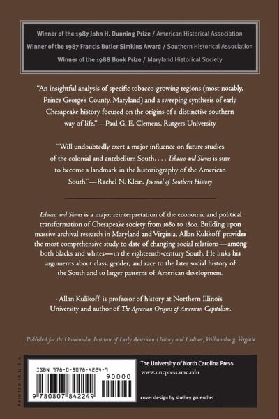 Tobacco and Slaves is a major reinterpretation of the economic and political transformation of Chesapeake society from 1680 to 1800. Building upon massive archival research in Maryland and Virginia, Allan Kulikoff provides the most comprehensive study to date of changing social relations--among both blacks and whites--in the eighteenth-century South. He links his arguments about class, gender, and race to the later social history of the South and to larger patterns of American development. Allan Kulikoff is professor of history at Northern Illinois University and author of The Agrarian Origins of American Capitalism.