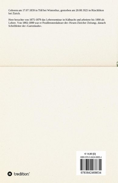 Geboren am 17.07.1859 in Töß bei Winterthur, gestorben am 20.08.1925 in Rüschlikon bei Zürich. Heer besuchte von 1875-1879 das Lehrerseminar in Küßnacht und arbeitete bis 1890 als Lehrer. Von 1892-1899 war er Feuilletonredaktuer der ¿Neuen Züricher Zeitung¿, danach Schriftleiter der ¿Gartenlaube¿.