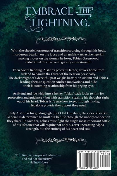 Embrace the lightning...Or be destroyed by the storm. With the chaotic hormones of transition coursing through his body, murderous bearkin on the loose and an unfairly attractive tigerkin making moves on the woman he loves, Tobias Greenwood didn't think his life could get any more stressful. Then Andre Redding, Aislinn's powerful father, arrives home from Ireland to handle the threat of the bearkin personally. The dark weight of a deceitful past weighs heavily on Aislinn and Tobias, leading them to question Andre's motivations and hide their blossoming relationship from his prying eyes. As friend and foe whip into a frenzy, Tobias' pack looks to him for protection and guidance - but with transition stealing his thoughts right out of his head, Tobias isn't sure how to get through his day, let alone provide the support they need. Only Aislinn is his guiding light, but Olaf Gruybere, the vicious bearkin General, is determined to snuff out her life through the unholy connection they share. To save her, Tobias must fight the single most important battle of his life; one that will require not only his ever-increasing Alpha strength, but the entirety of his heart and soul.