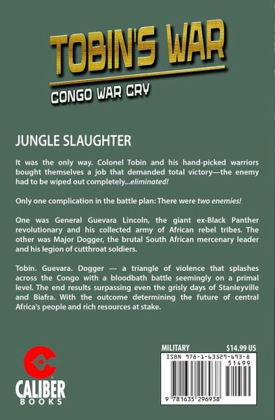 The action/adventures of Colonel Tobin's covert military unit continue! JUNGLE SLAUGHTER It was the only way. Colonel Tobin and his hand-picked warriors bought themselves a job that demanded total victory-the enemy had to be wiped out completely...eliminated! Only one complication in the battle plan: There were two enemies! One was General Guevara Lincoln, the giant ex-Black Panther revolutionary and his collected army of African rebel tribes. The other was Major Dogger, the brutal South African mercenary leader and his legion of cutthroat soldiers. Tobin. Guevara. Dogger - a triangle of violence that splashes across the Congo with a bloodbath battle seemingly on a primal level. The end results surpassing even the grisly days of Stanleyville and Biafra. With the outcome determining the future of central Africa's people and rich resources at stake.