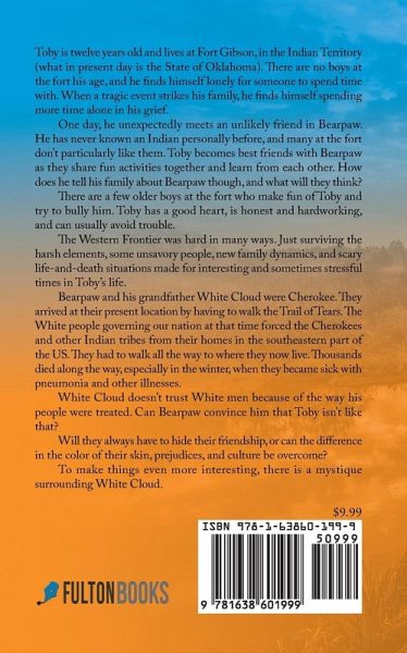 Toby is twelve years old and lives at Fort Gibson, in the Indian Territory (what in present day is the State of Oklahoma). There are no boys at the fort his age, and he finds himself lonely for someone to spend time with. When a tragic event strikes his family, he finds himself spending more time alone in his grief. One day, he unexpectedly meets an unlikely friend in Bearpaw. He has never known an Indian personally before, and many at the fort don't particularly like them. Toby becomes best friends with Bearpaw as they share fun activities together and learn from each other. How does he tell his family about Bearpaw though, and what will they think? There are a few older boys at the fort who make fun of Toby and try to bully him. Toby has a good heart, is honest and hardworking, and can usually avoid trouble. The Western Frontier was hard in many ways. Just surviving the harsh elements, some unsavory people, new family dynamics, and scary life-and-death situations made for interesting and sometimes stressful times in Toby's life. Bearpaw and his grandfather White Cloud were Cherokee. They arrived at their present location by having to walk the Trail of Tears. The White people governing our nation at that time forced the Cherokees and other Indian tribes from their homes in the southeastern part of the US. They had to walk all the way to where they now live. Thousands died along the way, especially in the winter, when they became sick with pneumonia and other illnesses. White Cloud doesn't trust White men because of the way his people were treated. Can Bearpaw convince him that Toby isn't like that? Will they always have to hide their friendship, or can the difference in the color of their skin, prejudices, and culture be overcome? To make things even more interesting, there is a mystique surrounding White Cloud.