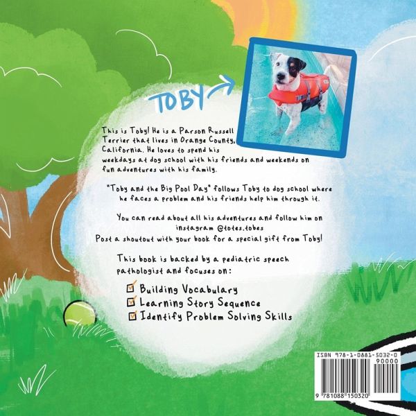 Toby the Parson Russell Terrier goes to dog school and discovers a pool. He realizes he can't swim to join his friends and his friends help him along the way. This book is backed by a pediatric speech therapist and promotes vocabulary building, problem solving skills, and learning story sequence
