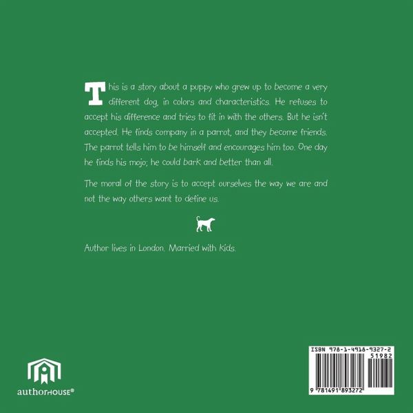 This is a story about a puppy who grew up to become a very different dog, in colors and characteristics. He refuses to accept his difference and tries to fit in with the others. But he isn't accepted. He finds company in a parrot, and they become friends. The parrot tells him to be himself and encourages him too. One day he finds his mojo; he could bark and better than all. The moral of the story is to accept ourselves the way we are and not the way others want to define us.