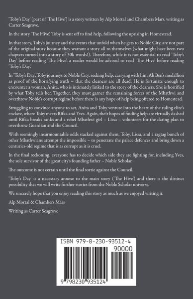 'Toby's Day' (part of 'The Hive') is a story written by Alp Mortal and Chambers Mars, writing as Carter Seagrove. In the story 'The Hive', Toby is sent off to find help, following the uprising in Homestead. In that story, Toby's journey and the events that unfold when he gets to Noble City, are not part of the original story because they warrant a story all to themselves (what might have been two chapters turned into a story of 30k words!). Therefore, while it is not essential to read 'Toby's Day' before reading 'The Hive', a reader would be advised to read 'The Hive' before reading 'Toby's Day'. In 'Toby's Day', Toby journeys to Noble City, seeking help, carrying with him Ali Ben's medallion as proof of the horrifying truth - that the cleaners are all dead. He is fortunate enough to encounter a woman, Anita, who is intimately linked to the story of the cleaners. She is horrified by what Toby tells her. Together, they must garner the remaining forces of the Mbathwi and overthrow Noble's corrupt regime before there is any hope of help being offered to Homestead. Struggling to convince anyone to act, Anita and Toby venture into the heart of the ruling elite's enclave, where Toby meets Rifka and Yves. Again, their hopes of finding help are virtually dashed until Rifka breaks ranks and a rebel Mbathwi girl - Lissa - volunteers for the daring plan to overthrow Guardian and the Council. With seemingly insurmountable odds stacked against them, Toby, Lissa, and a ragtag bunch of other Mbathwians attempt the impossible - to penetrate the palace defences and bring down a centuries-old regime that is as corrupt as it is cruel. In the final reckoning, everyone has to decide which side they are fighting for, including Yves, the sole survivor of the great city's founding father - Noble Scholar. The outcome is not certain until the final sortie against the Council. 'Toby's Day' is a necessary annexe to the main story ('The Hive') and there is the distinct possibility that we will write further stories from the Noble Scholar universe. We sincerely hope that you enjoy reading this story as much as we enjoyed writing it. Alp Mortal & Chambers Mars Writing as Carter Seagrove