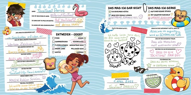 Singen, tanzen oder TocaToast schauen - egal, was dein Hobby ist, gemeinsam macht es doch am meisten Spaß! In diesem Freundschaftsbuch im »Toca Boca«-Style haben alle deine Freund_innen Platz. Witzige Nachrichten schreiben, etwas Malen und Grußbotschaften hinterlassen - eurer Kreativität sind keine Grenzen gesetzt! Lerne deine Lieblingsmenschen durch kreative Fragen noch besser kennen und finde heraus, welche Starqualitäten sie haben.