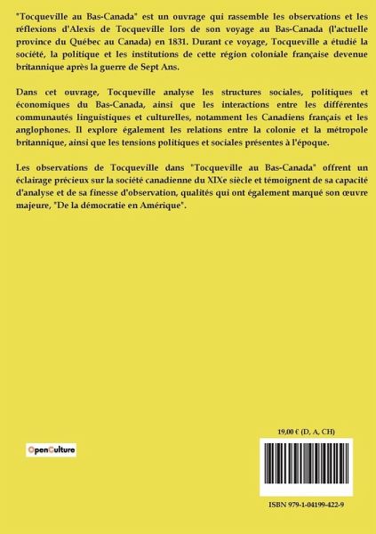 "Tocqueville au Bas-Canada" est un ouvrage qui rassemble les observations et les réflexions d'Alexis de Tocqueville lors de son voyage au Bas-Canada (l'actuelle province du Québec au Canada) en 1831. Durant ce voyage, Tocqueville a étudié la société, la politique et les institutions de cette région coloniale française devenue britannique après la guerre de Sept Ans. Dans cet ouvrage, Tocqueville analyse les structures sociales, politiques et économiques du Bas-Canada, ainsi que les interactions entre les différentes communautés linguistiques et culturelles, notamment les Canadiens français et les anglophones. Il explore également les relations entre la colonie et la métropole britannique, ainsi que les tensions politiques et sociales présentes à l'époque. Les observations de Tocqueville dans "Tocqueville au Bas-Canada" offrent un éclairage précieux sur la société canadienne du XIXe siècle et témoignent de sa capacité d'analyse et de sa finesse d'observation, qualités qui ont également marqué son ¿uvre majeure, "De la démocratie en Amérique".