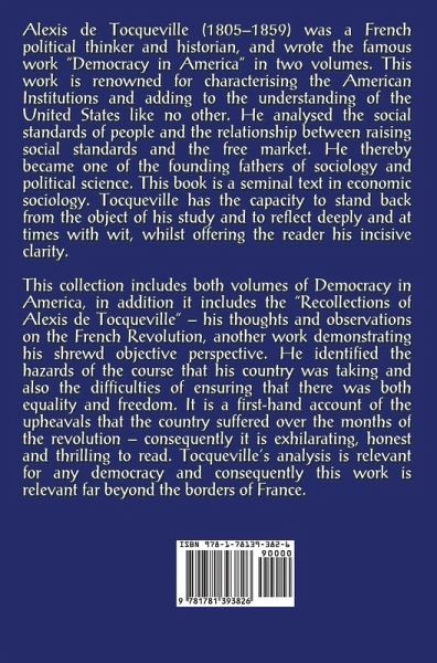 Alexis de Tocqueville (1805-1859) was a French political thinker and historian, and wrote the famous work "Democracy in America" in two volumes. This work is renowned for characterising the American Institutions and adding to the understanding of the United States like no other. He analysed the social standards of people and the relationship between raising social standards and the free market. He thereby became one of the founding fathers of sociology and political science. This book is a seminal text in economic sociology. Tocqueville has the capacity to stand back from the object of his study and to reflect deeply and at times with wit, whilst offering the reader his incisive clarity. This collection includes both volumes of Democracy in America, in addition it includes the "Recollections of Alexis de Tocqueville" - his thoughts and observations on the French Revolution, another work demonstrating his shrewd objective perspective. He identified the hazards of the course that his country was taking and also the difficulties of ensuring that there was both equality and freedom. It is a first-hand account of the upheavals that the country suffered over the months of the revolution - consequently it is exhilarating, honest and thrilling to read. Tocqueville's analysis is relevant for any democracy and consequently this work is relevant far beyond the borders of France.
