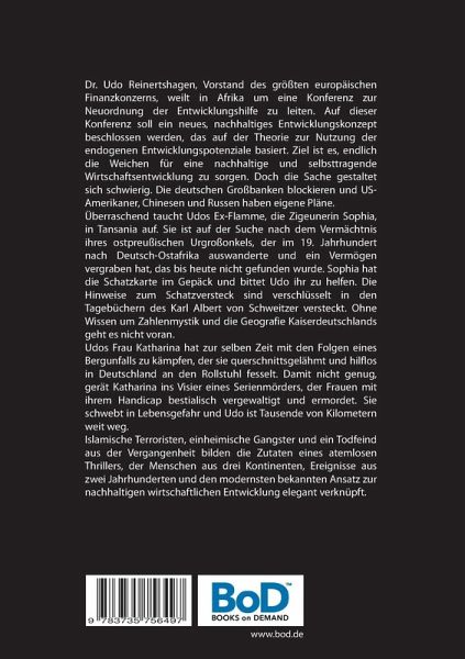 Dr. Udo Reinertshagen, Vorstandsmitglied des größten europäischen Finanzkonzerns, der Ersten Allgemeinen Finanz-Gruppe, weilt in Afrika, um eine Konferenz zur Neuordnung der Entwicklungshilfe für den schwarzen Kontinent vorzubereiten. Auf dieser Konferenz soll von den Europäern ein neues, nachhaltiges Entwicklungskonzept beschlossen werden, das auf der Theorie zur Nutzung der endogenen Entwicklungspotenziale basiert. Das Ziel dieser Konferenz ist es, endlich die Weichen für eine nachhaltige und selbsttragende Wirtschaftsentwicklung zu stellen. Doch die Sache gestaltet sich schwierig. Die deutschen Großbanken blocken und die US-Amerikaner, Chinesen und Russen haben eigene Pläne, wie sie ihr Schäfchen in Afrika ins Trockene bringen können.Da taucht überraschend seine Ex-Flamme, die Zigeunerin Sophia, in Daressalam auf. Sie gibt vor, eine Safarireise gebucht zu haben. In Wirklichkeit ist sie auf der Suche nach dem Vermächtnis ihres ostpreußischen Urgroßonkels, der im 19. Jahrhundertnach Deutsch-Ostafrika auswanderte und in Tansania ein Vermögen vergraben hat, das bis heute nicht gefunden wurde. Sophia hat die Schatzkarte im Gepäck und überredet Udo, ihr zu helfen. Doch das ist nicht so einfach, wie es scheint. Die Hinweise zum Schatzversteck sind verschlüsselt in den Tagebüchern des Karl Albert von Schweitzer versteckt. Ohne Wissen um Zahlenmystik und die Geografie Vorkriegsdeutschlands geht es nicht voran.Noch dazu steckt Udo in einem persönlichen Dilemma. Seine Frau Katharina hat zur selben Zeit mit den Folgen eines Bergunfalls zu kämpfen, der sie hilflos und querschnittsgelähmt in Deutschland an den Rollstuhl fesselt. Damit nicht genug, gerät Katharina ins Visier eines Serienmörders, der Frauen mit ihrem Handicap bestialisch vergewaltigt und ermordet. Katharina schwebt in Lebensgefahr und Udo ist Tausende von Kilometern weit weg, mitten in der Serengeti.Sophia und Udo geraten bei ihrer Suche am höchsten Berg Afrikas zwischen die Fronten: Islamische Terroristen, einheimische Gangster und ein Todfeind aus der Vergangenheit bereiten einen tödlichen Cocktail, der Menschen aus drei Kontinenten, Ereignisse aus zwei Jahrhunderten und den modernsten bekannten Ansatz zur nachhaltigen wirtschaftlichen Entwicklung elegant zu einem atemlosen Thriller verknüpft. Es lauert der Tod am Kilimandjaro.