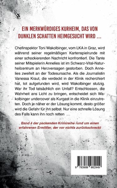 Ein merkwürdiges Kurheim, das von dunklen Schatten heimgesucht wird … Band 4 der packenden Krimireihe rund um einen erfahrenen Ermittler, der vor nichts zurückschreckt Chefinspektor Toni Wakolbinger, vom LKA in Graz, wird während seiner regelmäßigen Kartenspielrunde mit einer schockierenden Nachricht konfrontiert. Die Tante seiner Mitspielerin Annelies ist im Schwarz-Vital-Naturheilzentrum an Herzversagen gestorben. Doch Annelies zweifelt an der Todesursache. Als die Journalistin Vanessa Kraut, die verdeckt in der Klinik recherchiert hat, tot aufgefunden wird, wird Wakolbinger stutzig. War ihr Tod tatsächlich ein Unfall? Entschlossen, die Wahrheit ans Licht zu bringen, entscheidet sich Wakolbinger undercover als Kurgast in die Klinik einzutreten. Doch je näher er der Lösung kommt, desto größer wird die Gefahr für ihn selbst. Nur eine schnelle Lösung des Falls kann ihn noch retten … Erste Leser:innenstimmen „Wieder ein spannendes Ermittlungsabenteuer mit einem sympathischen Ermittler!" „Die Undercover-Mission im Naturheilzentrum ist nervenaufreibend und sehr mitreißend beschrieben." „Eine packende Kombination aus mysteriösen Todesfällen und der persönlichen Gefahr des Polizisten!" „Eine spannende Krimi Fortsetzung zum Mitfiebern!"