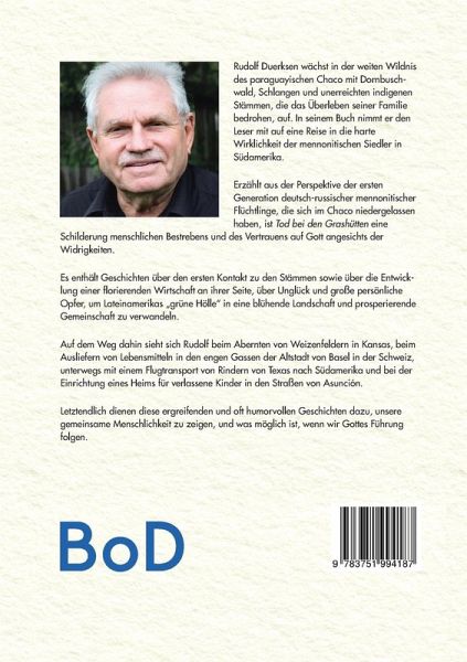 Rudolf Duerksen wächst in der weiten Wildnis des paraguayischen Chaco mit Dornbuschwald, Schlangen und unerreichten indigenen Stämmen, die das Überleben seiner Familie bedrohen, auf. In seinem Buch nimmt er den Leser mit auf eine Reise in die harte Wirklichkeit der mennonitischen Siedler in Südamerika. Erzählt aus der Perspektive der ersten Generation deutsch-russischer mennonitischer Flüchtlinge, die sich im Chaco niedergelassen haben, ist Tod bei den Grashütten eine Schilderung menschlichen Bestrebens und des Vertrauens auf Gott angesichts der Widrigkeiten. Es enthält Geschichten über den ersten Kontakt zu den Stämmen sowie über die Entwicklung einer florierenden Wirtschaft an ihrer Seite, über Unglück und große persönliche Opfer, um Lateinamerikas "grüne Hölle" in eine blühende Landschaft und prosperierende Gemeinschaft zu verwandeln.Auf dem Weg dahin sieht sich Rudolf beim Abernten von Weizenfeldern in Kansas, beim Ausliefern von Lebensmitteln in den engen Gassen der Altstadtvon Basel in der Schweiz, unterwegs mit einem Flugtransport von Rindern von Texas nach Südamerika und bei der Einrichtung eines Heims für verlassene Kinder in den Straßen von Asunción. Letztendlich dienen diese ergreifenden und oft humorvollen Geschichten dazu, unsere gemeinsame Menschlichkeit zu zeigen, und was möglich ist, wenn wir Gottes Führung folgen.