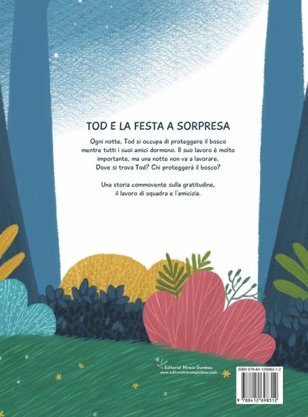 Ogni notte, Tod si occupa di proteggere il bosco mentre tutti i suoi amici dormono. Il suo lavoro è molto importante, ma una notte non va a lavorare. Dove si trova Tod? Chi proteggerà il bosco? Tod e la festa a sorpresa è un libro tenero e affettuoso. Una storia sulla responsabilità, la gratitudine, l'empatia e l'amicizia. Questa fiaba ha il compito importante di aprire gli occhi e insegnarci ad apprezzare ciò che gli altri fanno per noi. Una favola che conquisterà i più piccoli!