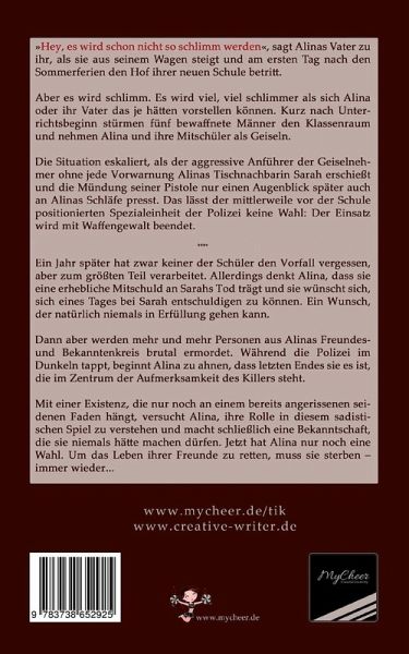 »Hey, es wird schon nicht so schlimm werden«, sagt Alinas Vater zu ihr, als sie aus seinem Wagen steigt und am ersten Tag nach den Sommerferien den Hof ihrer neuen Schule betritt.Aber es wird schlimm. Es wird viel, viel schlimmer als sich Alina oder ihr Vater das je hätten vorstellen können. Kurz nach Unterrichtsbeginn stürmen fünf bewaffnete Männer den Klassenraum und nehmen Alina und ihre Mitschüler als Geiseln.Die Situation eskaliert, als der aggressive Anführer der Geiselnehmer ohne jede Vorwarnung Alinas Tischnachbarin Sarah erschießt und die Mündung seiner Pistole nur einen Augenblick später auch an Alinas Schläfe presst. Das lässt der mittlerweile vor der Schule positionierten Spezialeinheit der Polizei keine Wahl: Der Einsatz wird mit Waffengewalt beendet.Ein Jahr später hat zwar keiner der Schüler den Vorfall vergessen, aber zum größten Teil verarbeitet. Allerdings denkt Alina, dass sie eine erhebliche Mitschuld an Sarahs Tod trägt und sie wünscht sich, sich eines Tages bei Sarah entschuldigen zu können. Ein Wunsch, der natürlich niemals in Erfüllung gehen kann.Dann aber werden mehr und mehr Personen aus Alinas Freundes- und Bekanntenkreis brutal ermordet. Während die Polizei im Dunkeln tappt, beginnt Alina zu ahnen, dass letzten Endes sie es ist, die im Zentrum der Aufmerksamkeit des Killers steht.Mit einer Existenz, die nur noch an einem bereits angerissenen seidenen Faden hängt, versucht Alina, ihre Rolle in diesem sadistischen Spiel zu verstehen und macht schließlich eine Bekanntschaft, die sie niemals hätte machen dürfen. Jetzt hat Alina nur noch eine Wahl. Um das Leben ihrer Freunde zu retten, muss sie sterben - immer wieder...