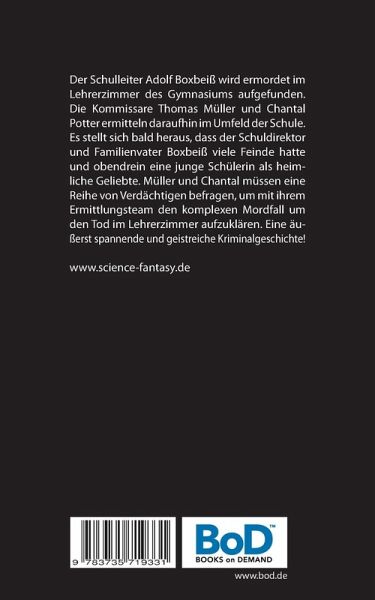 Der Schulleiter Adolf Boxbeiß wird ermordet im Lehrerzimmer des Gymnasiums aufgefunden. Die Kommissare Thomas Müller und Chantal Potter ermitteln daraufhin im Umfeld der Schule. Es stellt sich bald heraus, dass der Schuldirektor und Familienvater Boxbeiß viele Feinde hatte und obendrein eine junge Schülerin als heimliche Geliebte. Müller und Chantal müssen eine Reihe von Verdächtigen befragen, um mit ihrem Ermittlungsteam den komplexen Mordfall um den Tod im Lehrerzimmer aufzuklären. Eine äußerst spannende und geistreiche Kriminalgeschichte!www.science-fantasy.de