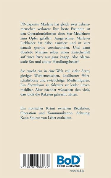 PR-Expertin Marlene hat gleich zwei Lebensmenschen verloren: Ihre beste Freundin ist den Operationskünsten eines Star-Mediziners zum Opfer gefallen. Ausgerechnet Marlenes Liebhaber hat dabei assistiert und ist kurz danach spurlos verschwunden. Und dann überlebt Marlene selber einen Zwischenfall auf einer Party nur ganz knapp. Also Alarmstufe Rot und akuter Handlungsbedarf.Sie taucht ein in eine Welt voll eitler Ärzte, gieriger Werbemenschen, knallharter Wirtschaftsbosse und zwielichtiger Medienfiguren. Ein Showdown zu Silvester ist leider unvermeidbar. Aber nachher wünschen sich viele, dass bloß die Raketen gekracht hätten. Ein ironischer Krimi zwischen Redaktion, Operation und Kommunikation. Achtung: Kann Spuren von Leber enthalten.