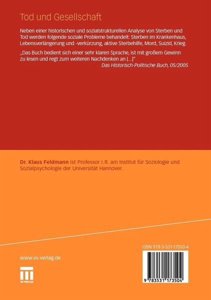 "Der Text liefert einen guten Überblick über und Einblick in sozialwissenschaftliches Wissen und umfassende Literatur zum Thema, beruhend auf der langen und intensiven Befassung von Klaus Feldmann mit der Thanatosoziologie." www.socialnet.de 15.2.2005