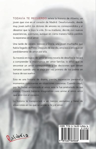 Todavía te recuerdo relata la historia de Alberto, un joven que vive en el corazón de Madrid. Desafortunado, desde muy joven sufrió los dolores de amores no correspondidos y el desamor que le trajo la vida. En su madurez, decide vivir nuevas experiencias, aventuras, aunque en cierta manera había perdido la esperanza en el amor. Una tarde de verano, conoce a Gloria, una joven muchacha que había llegado de Pinto. Después de ese día, empieza a enloquecer perdidamente de amor por ella. Su travesía en busca del amor en esta novela de desafíos le llevará a comprender la importancia del amor familiar, lo difícil que es encontrar un amor correspondido y las decisiones que deben tomarse cuando uno se aleja por vez primera de los padres en busca de sus sueños. Esta es una historia de drama, pasión, superación personal y momentos culminantes en situaciones concretas. Cuando creyó, por fin, haber encontrado el amor, este le fue arrebatado de sus manos. Cruzará barreras imaginables para unirse al único amor que amó con el corazón. La historia le transportará a un tiempo venturoso y lleno de situaciones en las que se unirán la fe y el amor.