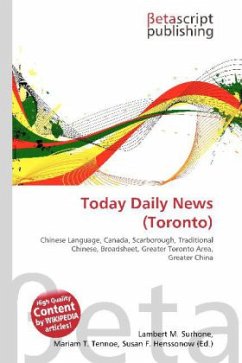 Please note that the content of this book primarily consists of articles available from Wikipedia or other free sources online. Today Daily News is a Chinese language newspaper in Canada, launched on November 1, 2005. It is published by Today Daily News International in Scarborough. It is called the Canada Eastern Edition even though it is the only edition published at the moment. The paper is published 7 days a week in traditional Chinese in the broadsheet format. News coverage includes headline news, news at the metro and national levels, news from Greater China, Chinese community news, international news, entertainment, financial news, sports, and supplements.