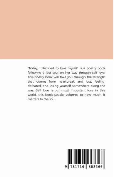 "Today, I decided to love myself" is a poetry book following a lost soul on her way through self love. This poetry book will take you through the strength that comes from heartbreak and loss, feeling defeated, and losing yourself somewhere along the way. Self love is our most important love in this world, this book speaks volumes to how much it matters to the soul.