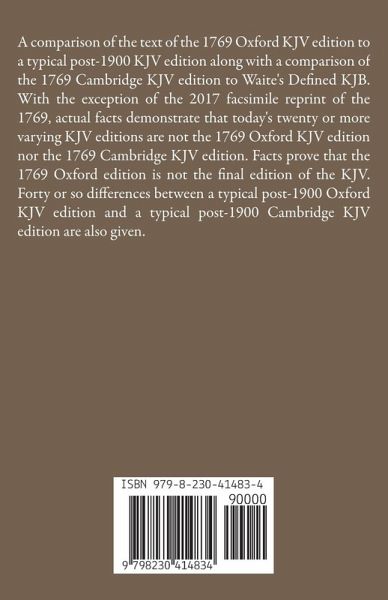 A comparison of the text of the 1769 Oxford KJV edition to a typical post-1900 KJV edition along with a comparison of the 1769 Cambridge KJV edition to the KJV edition in Waite's Defined KJB. It is demonstrated that today's KJV editions are not identical to the 1769 Oxford text since as many as 400 changes have been made to it. It is proven that all spelling updating in the KJV was not finished by 1769 and that the 1769 Oxford edition is not the final edition of the KJV.