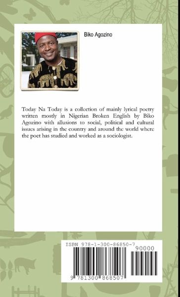 Today Na Today is a collection of mostly lyrical poetry written mainly in Nigerian Broken English as a popular medium for social, economic, political and cultural critique of local and global events.