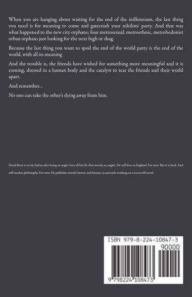 When you are hanging about waiting for the end of the millennium, the last thing you need is for meaning to come and gatecrash your nihilists' party. And that was what happened to the new city orphans; four metrosexual, metroethnic, metrohedonist urban orphans just looking for the next high or shag. Because the last thing you want to spoil the end of the world party is the end of the world, with all its meaning And the trouble is, the friends have wished for something more meaningful and it is coming, dressed in a human body and the catalyst to tear the friends and their world apart. And remember... No one can take the other's dying away from him.