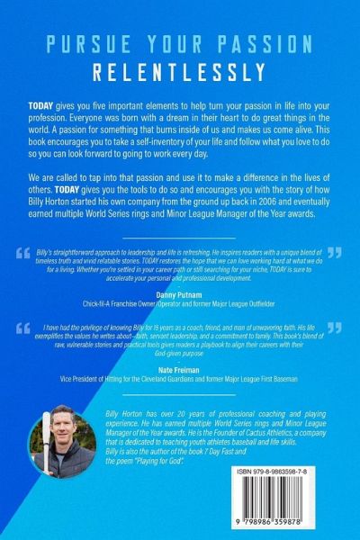 In this amazingly thoughtful and authentic book, Billy Horton openly shares his life story in hopes of inspiring anyone with a special passion to make it their profession. In Billy's words, "Many things happen on our journey into a career choice. Life is a series of experiences that help define who we are and who we will become. Along the way we make decisions and determine if the risk involved is worth the reward in the end. I believe we are all called to live amazing lives that will bless others. It takes a balance of wisdom and courage to follow our passions into our profession." TODAY gives you five important elements to help turn your passion in life into your profession. Everyone was born with a dream in their heart to do great things in the world. A passion for something that burns inside of us and makes us come alive. This book encourages you to take a self-inventory of your life and follow what you love to do so you can look forward to going to work every day. According to Billy, "We are called to tap into that passion, and use it to make a difference in the lives of others." TODAY gives you the tools to do so and encourages you with the story of how Billy Horton started his own company from the ground up back in 2006 and eventually earned multiple World Series rings and Minor League Manager of the Year awards. In concise and powerful messages, he encourages and enlightens readers to reach their goals by: Taking action, Overcoming challenges, Dreaming to visualize their future, Achieving success by working hard, and saying Yes when others may say no. Billy insightfully emphasizes that the key to making your passion your profession is to take the first step TODAY.