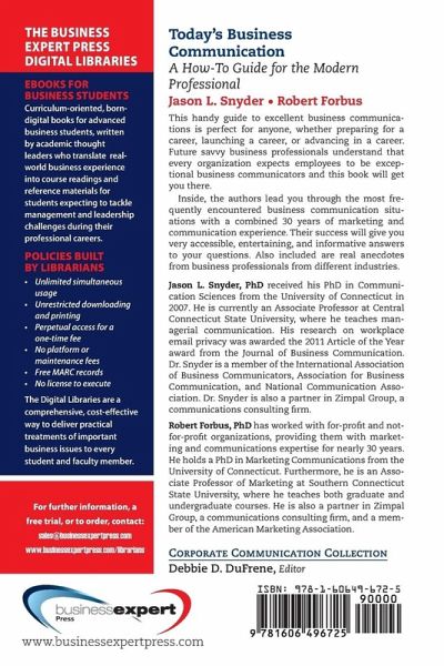 This handy guide to excellent business communications is perfect for anyone, whether preparing for a career, launching a career, or advancing in a career. Future savvy business professionals understand that every organization expects employees to be exceptional business communicators and this book will get you there. Inside, the authors lead you through the most frequently encountered business communication situations with a combined 30 years of marketing and communication experience. Their success will give you very accessible, entertaining, and informative answers to your questions. Also included are real anecdotes from business professionals from different industries.