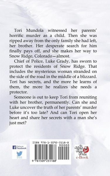 Tori Mundola witnessed her parents' horrific murder as a child. Then she was ripped away from the only family she had left, her brother. Her desperate search for him finally pays off, and she makes her way to Snow Ridge, Colorado-almost. Chief of Police, Luke Grady, has sworn to protect the residents of Snow Ridge. That includes the mysterious woman stranded on the side of the road in the middle of a blizzard. Tori has secrets, and the more he learns of them, the more he realizes she needs a protector. Someone is out to keep Tori from reuniting with her brother, permanently. Can she and Luke uncover the truth of her parents' murder before it's too late? And can Tori open her heart and share her secrets with a man she's just met?