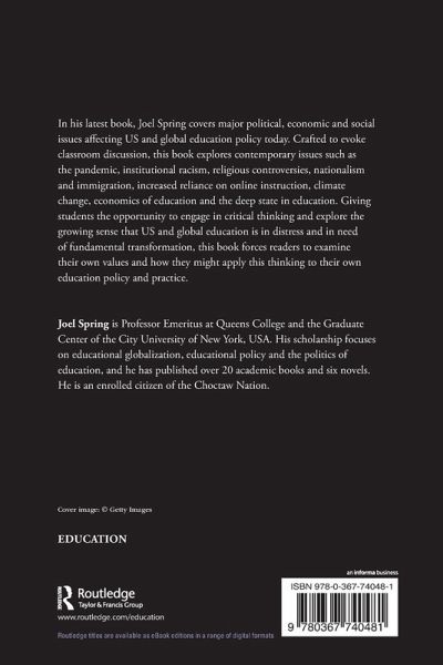 In his latest book, Joel Spring covers major political, economic and social issues affecting US and global education policy today. Crafted to evoke classroom discussion, this book explores contemporary issues such as the pandemic, institutional racism, religious controversies, nationalism and immigration, increased reliance on online instruction, climate change, economics of education and the deep state in education. Giving students the opportunity to engage in critical thinking and explore the growing sense that US and global education is in distress and in need of fundamental transformation, this book forces readers to examine their own values and how they might apply this thinking to their own education policy and practice.