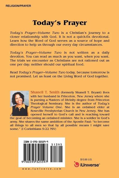 Today's Prayer Volume Two is a Christian's journey to a closer relationship with God. It is not a quick-fix devotional. Learn how the Word of God serves as a source of hope and direction to help us through our every day circumstances. Today's Prayer Volume Two is not written as a daily devotion. You can read as much as you want, when you want. The trials we encounter as Christians are not rationed out as one per day; neither should our spiritual food. Read Today's Prayer Volume Two today, because tomorrow is not promised. Let us feast on the Living Word of God together.