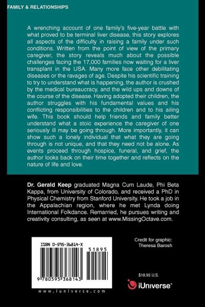 A wrenching account of one family's five-year battle with what proved to be terminal liver disease, this story explores all aspects of the difficulty in raising a family under such conditions. Written from the point of view of the primary caregiver, the story reveals much about the possible challenges facing the 17,000 families now waiting for a liver transplant in the USA. Many more face other debilitating diseases or the ravages of age. Despite his scientific training to try to understand what is happening, the author is crushed by the medical bureaucracy, and the wild ups and downs of the course of the disease. Having adopted their children, the author struggles with his fundamental values and his conflicting responsibilities to the children and to his ailing wife. This book should help friends and family better understand what a stoic experience the caregiver of one seriously ill may be going through. More importantly, it can show such a lonely individual that what they are going through is not unique, and that they need not be alone. As events proceed through hospice, funeral, and grief, the author looks back on their time together and reflects on the nature of life and love.