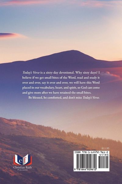 Today's Verse is a sixty-day devotional. Why sixty days? I believe if we get small bites of the Word, read and study it over and over, say it over and over, we will have this Word placed in our vocabulary, heart, and spirit, so God can come and give more after we have retained the small bites. Be blessed, be comforted, and don't miss Today's Verse.