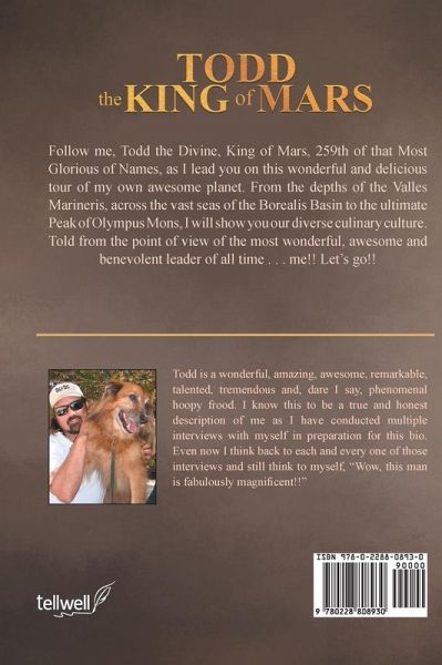 Follow me, Todd the Divine, King of Mars, 259th of that Most Glorious of Names, as I lead you on this wonderful and delicious tour of my own awesome planet. From the depths of the Valles Marineris, across the vast seas of the Borealis Basin to the ultimate Peak of Olympus Mons, I will show you our diverse culinary culture. Told from the point of view of the most wonderful, awesome and benevolent leader of all time . . . me!! Let's go!!