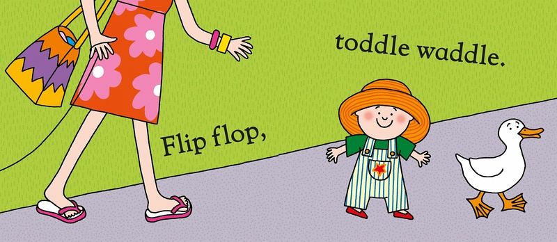 Join the fun of Toddler Time! Toddle Waddle is a fun noisy story from Julia Donaldson, author of The Gruffalo, and Nick Sharratt. With a FREE audio reading! There's a hullabaloo at the seaside when a toddler takes his friends on a stroll to the end of the pier. There are buzzing bees, bicycle bells and a whole beachful of noisy fun. Even the smallest toddler will enjoy the wonderfully silly sounds in this book, so join in and waddle along - you've never been on a walk like it! In sturdy board book format, Toddle Waddle is perfect for younger readers and ideal for reading out loud together! Julia Donaldson's charming story and Nick Sharratt's mischievous and funny illustrations make this bright and playful book a sure winner. Look out for other Toddler Time stories: Hippo Has a Hat, Animal Music and Goat Goes to Nursery.