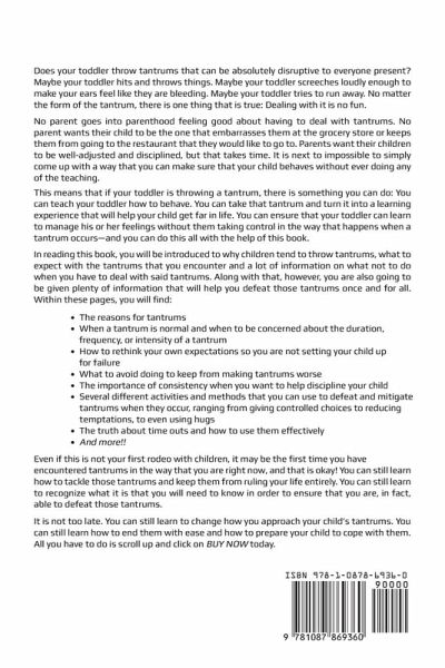 Does your toddler throw tantrums that can be absolutely disruptive to everyone present? Maybe your toddler hits and throws things. Maybe your toddler screeches loudly enough to make your ears feel like they are bleeding. Maybe your toddler tries to run away. No matter the form of the tantrum, there is one thing that is true: Dealing with it is no fun. No parent goes into parenthood feeling good about having to deal with tantrums. No parent wants their child to be the one that embarrasses them at the grocery store or keeps them from going to the restaurant that they would like to go to. Parents want their children to be well-adjusted and disciplined, but that takes time. It is next to impossible to simply come up with a way that you can make sure that your child behaves without ever doing any of the teaching. This means that if your toddler is throwing a tantrum, there is something you can do: You can teach your toddler how to behave. You can take that tantrum and turn it into a learning experience that will help your child get far in life. You can ensure that your toddler can learn to manage his or her feelings without them taking control in the way that happens when a tantrum occurs—and you can do this all with the help of this book. In reading this book, you will be introduced to why children tend to throw tantrums, what to expect with the tantrums that you encounter and a lot of information on what not to do when you have to deal with said tantrums. Along with that, however, you are also going to be given plenty of information that will help you defeat those tantrums once and for all. Even if this is not your first rodeo with children, it may be the first time you have encountered tantrums in the way that you are right now, and that is okay! You can still learn how to tackle those tantrums and keep them from ruling your life entirely. You can still learn to recognize what it is that you will need to know in order to ensure that you are, in fact, able to defeat those tantrums. It is not too late. You can still learn to change how you approach your child’s tantrums. You can still learn how to end them with ease and how to prepare your child to cope with them. All you have to do is scroll up and click on BUY NOW today.