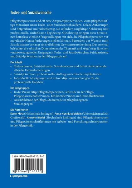 Pflegefachpersonen sind oft erste Ansprechpartner_innen, wenn pflegebedürftige Menschen einen Todes- oder Suizidwunsch äußern. Solche Äußerungen sind tiefgreifend und vielschichtig. Sie erfordern sorgfältige Abklärung und professionelle, einfühlsame Begleitung. Gleichzeitig bringen diese Situationen komplexe ethische Fragestellungen mit sich, die Pflegefachpersonen vor moralische Herausforderungen stellen können. Besonders der Wunsch nach Suizidassistenz verlangt eine reflektierte Gewissensentscheidung. Das essential beleuchtet die ethischen Dimensionen der Thematik und zeigt Wege für einen verantwortungsvollen Umgang mit Todes- und Suizidwünschen, Suizidassistenz und Suizidprävention in der Pflegepraxis auf.