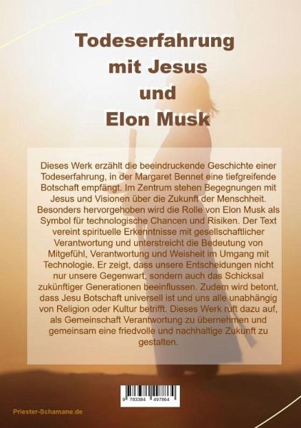 Die Todeserfahrung mit Jesus und Elon Musk beschreibt ein mystisches Erlebnis zwischen Todeserfahrung und Nahtoderfahrung mit den Visionen und der Prophezeiung für die Zukunft durch Jesus über Elon Musk. Dieses Werk erzählt die beeindruckende Geschichte einer Todeserfahrung, in der die Protagonistin Margaret Bennet eine tiefgreifende Botschaft empfängt. Im Zentrum stehen Begegnungen mit Jesus und Visionen über die Zukunft der Menschheit. Besonders hervorgehoben wird die Rolle von Elon Musk als Symbol für technologische Chancen und Risiken. Der Text vereint spirituelle Erkenntnisse mit gesellschaftlicher Verantwortung und unterstreicht die Bedeutung von Mitgefühl, Verantwortung und Weisheit im Umgang mit Technologie. Er zeigt, dass unsere Entscheidungen nicht nur unsere Gegenwart, sondern auch das Schicksal zukünftiger Generationen beeinflussen. Zudem wird betont, dass Jesu Botschaft universell ist und uns alle unabhängig von Religion oder Kultur betrifft. Dieses Werk ruft dazu auf, als Gemeinschaft Verantwortung zu übernehmen und gemeinsam eine friedvolle und nachhaltige Zukunft zu gestalten.Gleich am Anfang des Buches geht der Priester Schamane auch auf Nahtoderfahrung und Todeserfahrung ein.