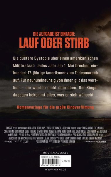 Dieses Buch trotzt nur vor Spannung, wie ich finde, denn in jeden Augenblick muss man damit rechnen, dass der Hauptcharakter, stehen bleibt, egal aus welchem Grund, doch dieses Stehenbleiben wird nach drei Verwarnungen für die Person tödlich enden. Die Soldaten tragen in diesem Buch nicht den leisesten Hauch von Erbarmen in sich und ihnen ist egal, ob man gerade dabei ist, seinen menschlichen Bedürfnissen nachzugehen, einen Stein im Schuh oder einen schmerzhaften Krampf in den Waden hat. Wer nicht nach drei Verwarnungen wieder anfängt zu laufen, wird gnadenlos erschossen.