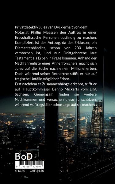 Privatdetektiv Jules van Dyck erhält von dem Notariat Phillipp Maassen den Auftrag, in einer Erbschaftssache Personen ausfindig zu machen. Kompliziert ist der Auftrag, da der Erblasser, ein Diamantenhändler, schon vor 200 Jahren verstorben ist, und nur Drittgeborene laut Testament als Erben in Frage kommen. Anhand der Nachfahrenliste eines Ahnenforschers macht sich Jules auf die Suche nach einem Millionenerben. Doch während seiner Recherche stößt er nur auf tragische Unfälle möglicher Erben. Erst nachdem er Zusammenhänge erkennt, trifft er auf Hauptkommissar Benno Mickerts vom LKA Sachsen. Gemeinsam finden sie weitere Nachkommen und versuchen diese zu schützen, während Auftragskiller schon Jagd auf sie machen.