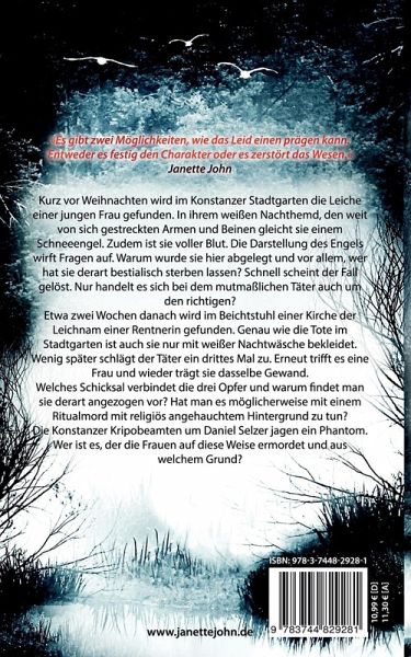»Es gibt zwei Möglichkeiten, wie das Leid einen prägen kann. Entweder es festigt den Charakter oder es zerstört das Wesen.« Janette JohnKurz vor Weihnachten wird im Konstanzer Stadtgarten die Leiche einer jungen Frau gefunden. In ihrem weißen Nachthemd, den weit von sich gestreckten Armen und Beinen gleicht sie einem Schneeengel. Zudem ist sie voller Blut. Die Darstellung des Engels wirft Fragen auf. Warum wurde sie hier abgelegt und vor allem, wer hat sie derart bestialisch sterben lassen? Schnell scheint der Fall gelöst. Nur handelt es sich bei dem mutmaßlichen Täter auch um den richtigen?Etwa zwei Wochen danach wird im Beichtstuhl einer Kirche der Leichnam einer Rentnerin gefunden. Genau wie die Tote im Stadtgarten ist auch sie nur mit weißer Nachtwäsche bekleidet. Wenig später schlägt der Täter ein drittes Mal zu. Erneut trifft es eine Frau, und wieder trägt sie dasselbe Gewand.Welches Schicksal verbindet die drei Opfer, und warum findet man sie derart angezogen vor? Hat man es möglicherweise mit einem Ritualmord mit religiös angehauchtem Hintergrund zu tun?Die Konstanzer Kripobeamten um Daniel Selzer jagen ein Phantom. Wer ist es, der die Frauen auf diese Weise ermordet und aus welchem Grund?Janette John ist erreichbar unter:www.janettejohn.dewww.facebook.com/Janette-John-KrimiAutorinwww.twitter.com/Janette_Johnwww.instagram/janettejohn_bodenseekrimi